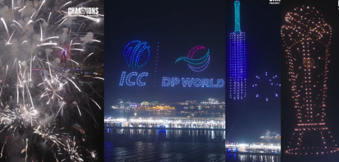 پہلے جہاں آتشبازی سے آسمان پر رنگ ونور کی برسات کی گئی، وہیں اس کے بعد آئی سی سی چیمپئنز ٹرافی کی خوبصورت ٹرافی کو لیزر لائٹ کے ذریعے آسمان پر جگمگایا گیا۔